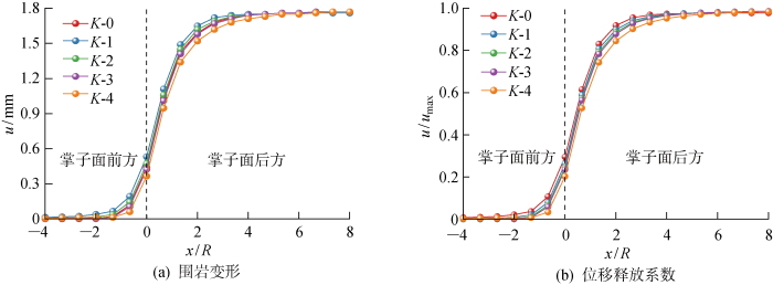 如图5 所示, K 的变化对围岩纵向变形曲线、位移释放系数曲线影响不显著,两者变化趋势相同.研究断面位移变形范围从掌子面前2倍隧道半径开始,到掌子面后6倍隧道半径抵达最大值.K是岩石的固有性质,当K 增大,相同应力条件下其变形将越小,但是支护状态并未发生改变,因此整体围岩-支护受力未改变,最大变形不变,K 增大将导致围岩变形曲线和位移释放曲线收敛缓慢.