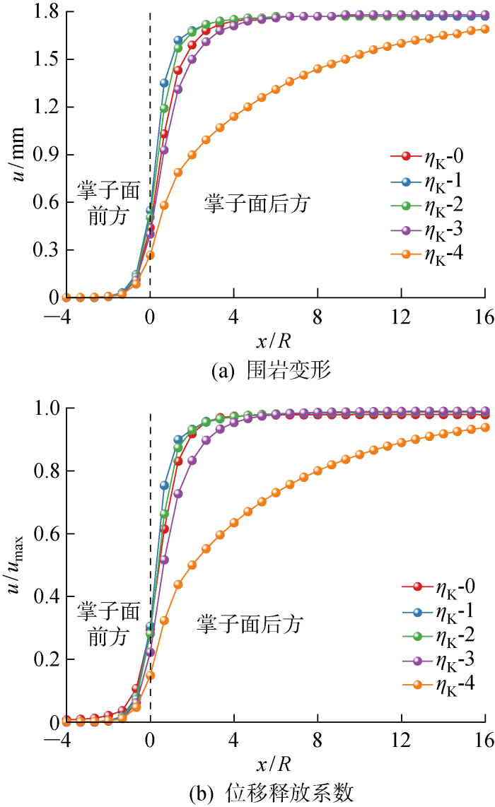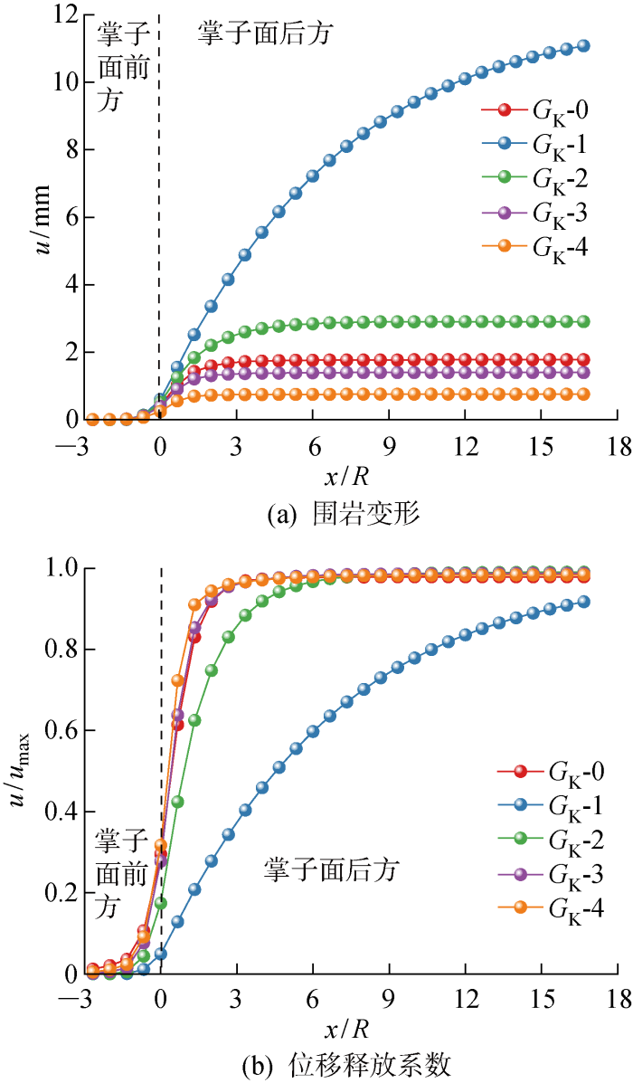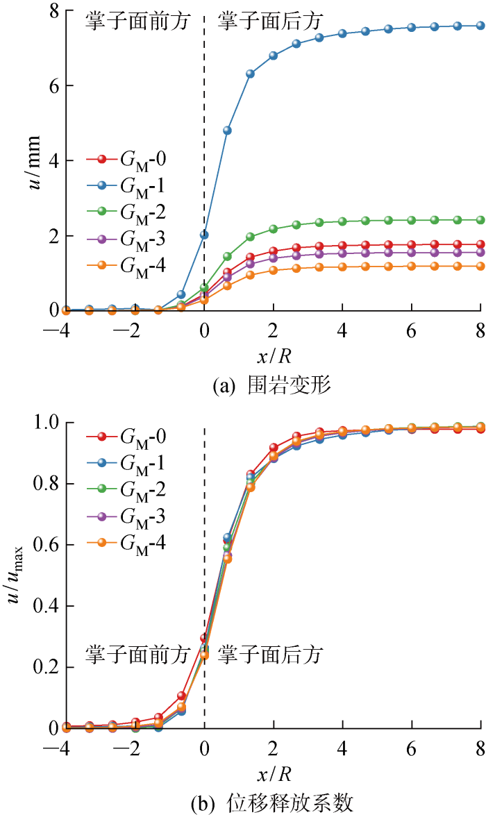 如图7 所示,G M 的减小会导致围岩变形的增加,其中工况G M -1围岩变形远大于其他工况;而位移释放系数随G M 的变化不显著.变形影响范围同样为掌子面前2倍隧道半径至掌子面后6倍隧道半径.G M 是与黏壶元件串联的弹簧元件的切变模量,可表示瞬时形态.相同受力条件下随着G M 的不断减小,围岩变形将不断增大.当G M 相对较大时,其对变形的影响相对较小,而当G M 足够小时,围岩变形将快速增大.由于不同G M 均形成了完整的S形曲线,所以相应的位移释放系数曲线基本保持一致.与G K 相比,G M 不同水平下各曲线间差异较小且围岩变形更小,因此参数G M 相较于参数G K 对围岩变形影响较小.