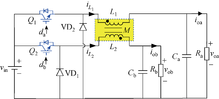CI-SIDO Buck变换器的电路拓扑如图1 所示.图中:v in 为输入电压; Q1 、Q2 为支路开关管;L1 、L2 为自感电感;M 为互感电感;VD1 、VD2 为支路续流二极管;C a 、C b 分别为a、b支路输出滤波电容; i L 1 、i L 2 为支路电感电流;i oa 、i ob 为支路a、b输出电流;d a 、d b 为支路a、b占空比;R a 、R b 分别为a、b支路负载;v oa 、v ob 分别为a、b支路输出电压.