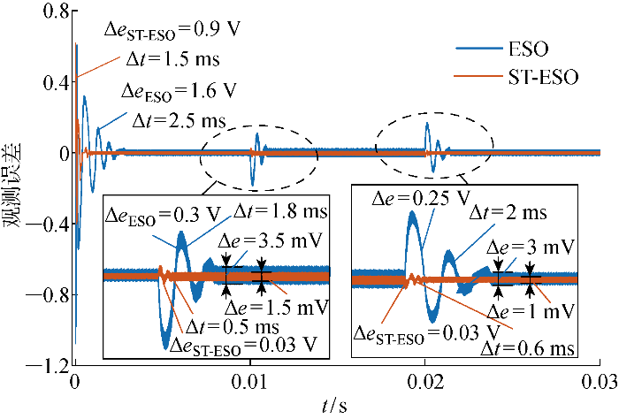... 式中: za 3 、zb 3 分别为xv 1 、xv 2 的估计值;za 4 、zb 4 分别为a、b输出支路扰动项估计值;e v1 、e v2 为观测误差;l 5 ~l 8 为观测器增益,并采用带宽法进行整定[30 ] , l5 =l7 =2wo ,l6 =l8 = w o 2 . ...