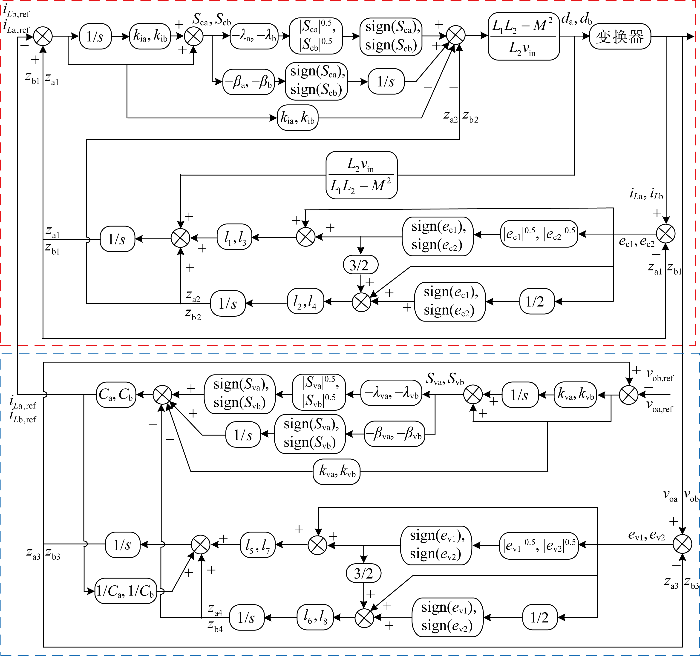 为了提高系统的扰动,将a、b支路中易受外界扰动的输出电流i oa 和i ob 以及外环扰动视为外界总扰动,并用f v1 和f v2 进行表示,则式(12)可重新表述为