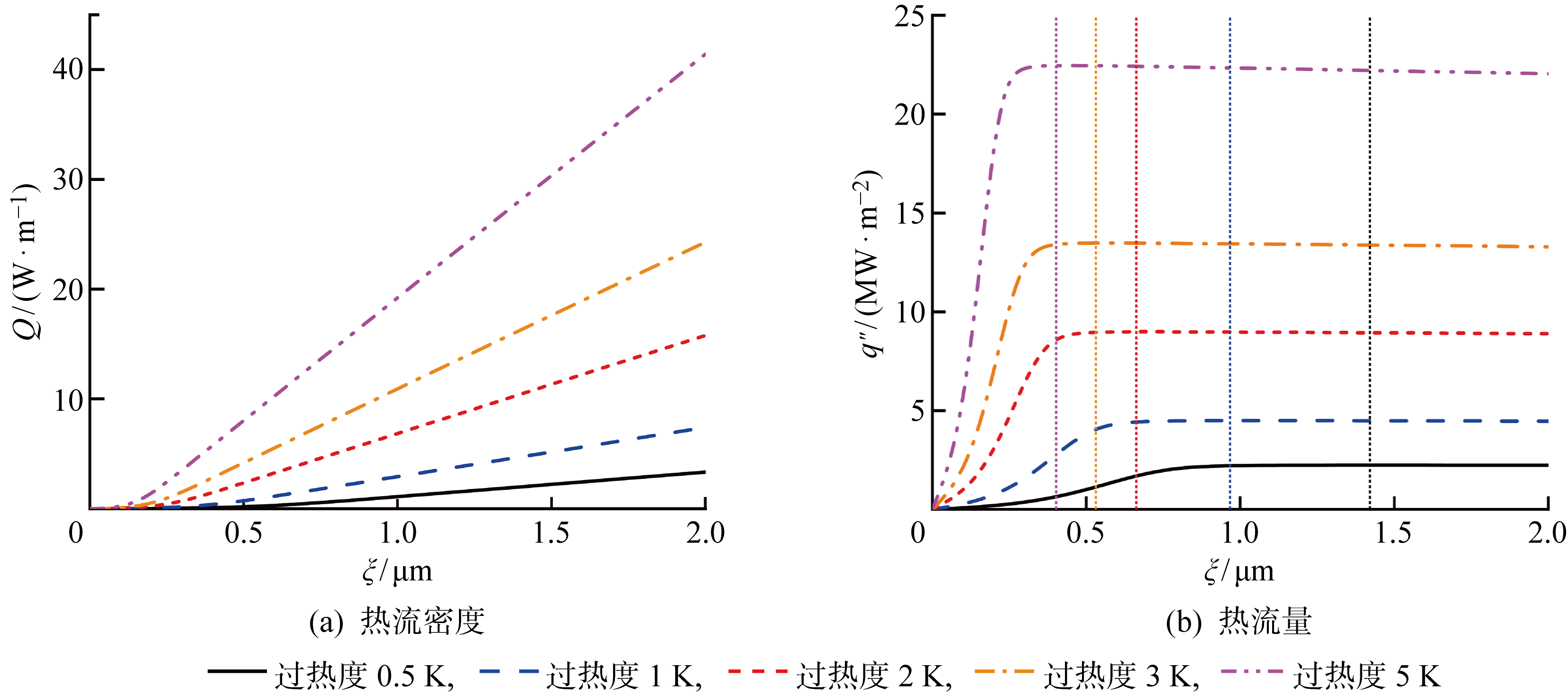 | 图10 不同壁面过热度下蒸发弯月面区域热流密度及热流量分布(钠) |