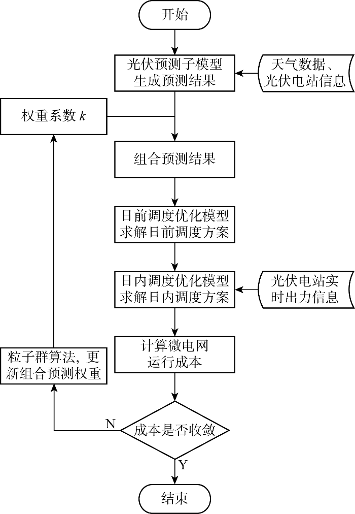 组合预测是新能源预测中常见的方法,预测子模型利用天气数据和光伏电站信息训练后输出子预测结果,根据各子模型的权重加权组合,求出输入日前调度模型的功率预测值[22 ] .不同预测权重使组合预测结果的导向性不同,传统的组合预测以精度为导向[23 ] ,用解析方法或启发式算法求解权重,预测结果的精度至少是子模型精度的下限.基于组合预测的方法,以组合预测权重系数为优化变量,提出以微电网运行效益(即运行成本)为导向的预测权重优化方法.