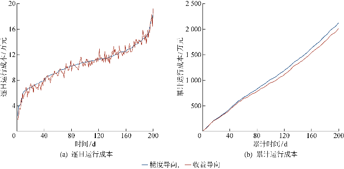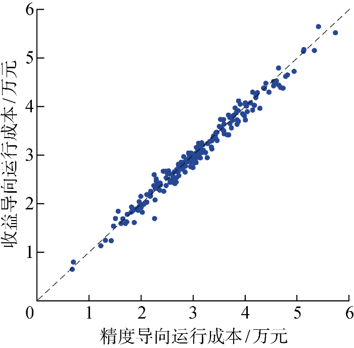 在测试集中,基于精度导向和收益导向预测结果求解得到的微电网运行成本如图3 所示.在200个样本日中,119个样本日的端到端模型求解出的运行成本低于精度导向模型的运行成本,占总样本量的59.5%.表6 给出根据各预测子模型的预测结果以及两种不同导向的组合预测结果进行日前和日内调度的微电网运行成本.端到端收益导向模型的最大日运行成本 、最小日运行成本与平均成本相比,精度导向模型分别减少1.53%、4.62%和1.45%.两种组合预测方法的微电网运行平均成本都低于单个预测子模型.