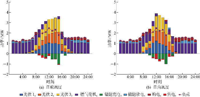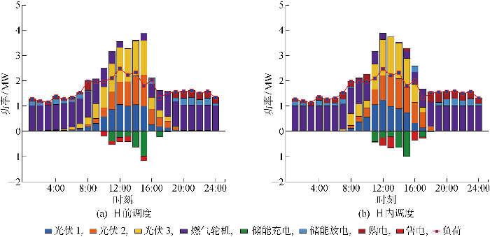 日内调度根据光伏预测值与实际值偏差调整微电网各单元的调度方案,包括燃气轮机机组出力的调整、向上级电网购售电量的调整和日内弃光量的调整;储能单元的日内调度方案不变.