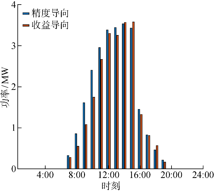 在测试集中以精度导向和收益导向的权重系数组合各子模型,得到光伏预测值分布如图2 所示.在200个样本日中,共有161个样本日的收益导向组合预测值小于精度导向组合预测值,占总样本量的80.5%.收益导向预测值平均比精度导向预测值小3.1%.