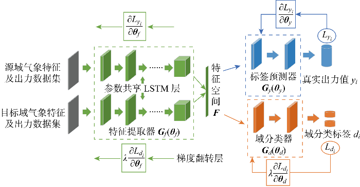 基于DANN-LSTM的小样本条件下可再生能源出力预测方法的基本原理包括数据正向映射和误差反向传播两个过程,这两个过程按先后顺序进行.正向映射是将数据输入特征提取器Gf (θf )映射到一个共同的特征空间F ;特征空间中源域电站数据集的特征向量则会经过预测器Gy (θy )的映射获得对应出力的预测结果;同时,源域电站和目标域电站的特征向量共同经过域分类器Gd (θd )得到每个输入的域分类结果.