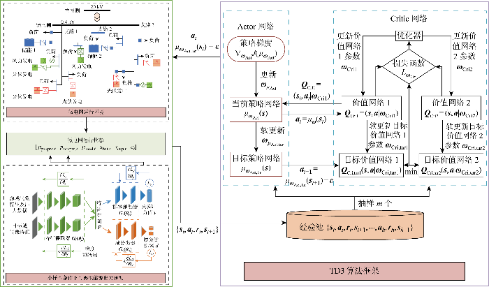 ... TD3是一种基于执行器-评判器(Actor-Critic)结构的算法[32 ] ,具体结构见图2 右侧TD3算法框架.Critic网络以微电网环境在t 时段的可再生能源出力、负荷、复合储能系统和实时电价等状态st 以及储能系统动作at 作为输入,输出Q 值函数 Q ω C r i ( st ,at ),该函数表示微电网在状态下st 储能系统采取动作at 所获得的预期累积奖励,用来评估储能系统在该状态下采取充放电动作at 的优劣程度,其中ω Cri 为Critic 网络参数.Actor 网络将t时段的微电网环境状态st 作为输入,输出储能系统动作策略 μ ω A c t ,微电网获得储能系统动作策略后,根据策略信息对潮流分布结果进行更新并将更新后的状态st +1 发送给储能系统以确保储能系统获得最新的状态信息,根据Q 值函数对储能系统动作策略进行更新,其中ω Act 为Actor 网络参数. ...