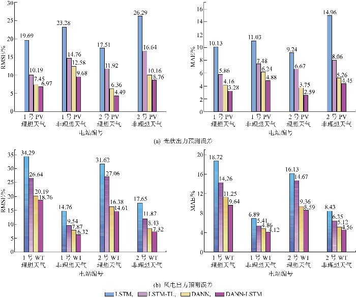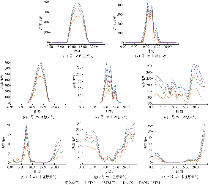 使用均方根误差和平均绝对误差(mean absolute error,MAE)作为评估预测精度的指标.图4 展示了相关精度指标,目标域中风电和光伏电站的预测结果与实际值对比如图5 所示.由图4 和图5 可知,新建微电网历史出力数据严重缺失,传统深度学习用于训练集的数据量过少易发生欠拟合,导致预测精度较差.在理想天气条件下1号和2号PV光伏出力预测结果的平均RMSE和MAE分别高达18.60%、9.68%,非理想天气条件下分别为24.78%、13.00%;在风电出力数据集上理想天气条件下的1号和2号PV平均RMSE和MAE分别为32.96%、17.42%,非理想天气条件下分别为16.20%、7.66%;当风光出力发生突变时,误差更加显著.而使用原深度学习网络模型中加入预训练-微调环节后(即图4 中LSTM-TL对应数据),能使数据量较少的目标域电站学习到相似源域电站的出力特性,在光伏出力预测和风电出力预测的平均精度上分别得到较大提升:理想天气条件下光伏出力数据集平均RMSE降低至11.06%,非理想天气条件下出力预测结果平均RMSE降低至15.70%,相应的平均MAE分别降低至6.26%和7.77%;风电预测任务上理想天气条件下平均RMSE、MAE分别降低至26.85%、14.46%,非理想天气条件下平均RMSE、MAE分别降低至10.70%、5.88%.然而,依赖公共知识的预训练网络在目标域上精确时间尺度上的预测效果仍然不高.DANN通过引入域对抗的方法同时训练源域和目标领域的任务,增强公共特征在目标领域上的映射效果进而提高出力预测精度,与基于模型迁移的方法相比,光伏出力预测结果在理想天气条件下平均RMSE和MAE分别降低4.15百分点、2.31百分点,在非理想天气条件下平均RMSE和MAE分别降低4.33百分点、2.02百分点;风电出力预测结果在理想条件下平均RMSE和MAE分别降低8.56百分点、4.16百分点,在非理想天气下平均RMSE和MAE分别降低2.56百分点和0.89百分点.