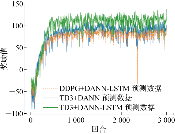 ... 为了展现所提方法的最优动作空间探索能力,分别将LSTM、LSTM-TL和传统DANN这3种方法与所提方法DANN-LSTM预测所得可再生能源出力作为状态空间进行训练,并将TD3算法与DDPG算法在4种状态空间下所得奖励值进行对比,选取在TD3算法中奖励值最高的两种结果和DDPG算法训练结果中奖励值最高的结果及对应的日运行成本进行展示.图8 和图9 分别给出智能体训练过程中的奖励值和日运行成本变化.由图可见,在初始阶段,由于训练不充分,所以智能体抽取到低奖励值经验的概率较高;随着智能体不断与环境交互并使用高奖励值经验改进策略,在后续训练过程中能够做出更优秀的调度决策并获得更高奖励值,最终学习到日运行成本最低的调度策略.DDPG算法在 2 400 回合奖励函数出现异常值,其原因是神经网络发生“网络退化”现象[32 ] .DDPG算法使用确定性策略,倾向于根据当前的最优动作选择策略.在初始训练阶段,随机性较大的探索有助于探索更多状态-动作对,并发现更好的储能系统充放电策略.但随着训练进行,随机性减少,模型趋向于利用已知的最优充放电动作,可能导致陷入局部最优解.在某些情况下,模型可能会重新探索先前被认为是次优的动作,即输出的策略朝着奖励值较低的轨迹上前进而导致奖励值骤降,随着经验回放缓冲区的更新和样本的变化,模型将有机会学习到更多高奖励的样本,从而使奖励值回到原来的收敛值.与DDPG算法相比,TD3通过在动作策略中加入噪声避免储能动作陷入局部最优,增大最优动作被探索到的概率,并通过值函数的双重更新减小值函数的估计误差,提高智能体控制储能系统在每一调度时段内做出最优充放电动作的决策能力. ...