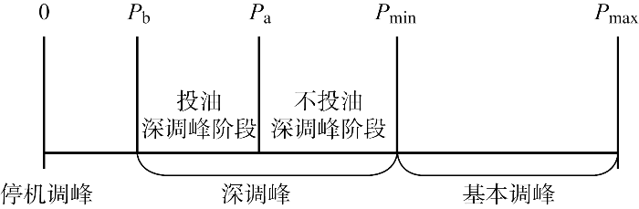参与调峰作业的火电机组,除正常出力运行方式外,根据其出力状态可划分为基本调峰阶段、深度调峰阶段以及停机调峰阶段.在基本调峰阶段,机组可以通过快速爬坡响应净负荷波动.深度调峰阶段可以实现机组出力的进一步降低,可按照调峰能力和燃烧介质不同划分为不投油深调峰阶段和投油深调峰阶段,如图1所示.图中:Pmax为火电机组最大技术出力;Pmin为基本调峰阶段最小技术出力;Pa为需要进行投油稳燃的技术出力界限;Pb为火电机组投油深调峰最小技术出力.