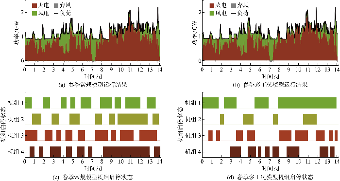 由图4、附录图A4~A7、表6和7可知,在多工况模型运行模拟时,4台机组采用不同时长的停机调峰,出现多次较长时间停机后的温态启动.其中,相比常规模型平均化的启停约束,多工况模型采用区分不同工况的火电机组停机模型大幅提升了温态 启停的时长,使得春、夏季机组累计停机调峰时长分别延长156 h和236 h.综合图4(a)、4(b)、附录A4和A5可以看出,电网中停机调峰时间延长导致多工况模型优化调度图像的弃风面积显著减少,提高了风电消纳程度.该场景算例验证了中长期尺度下多工况模型能够优化调峰过程中的机组停机组合,延长机组损耗较小的温态启停停机时长,增加风电可消纳区间,并降低运行总成本.