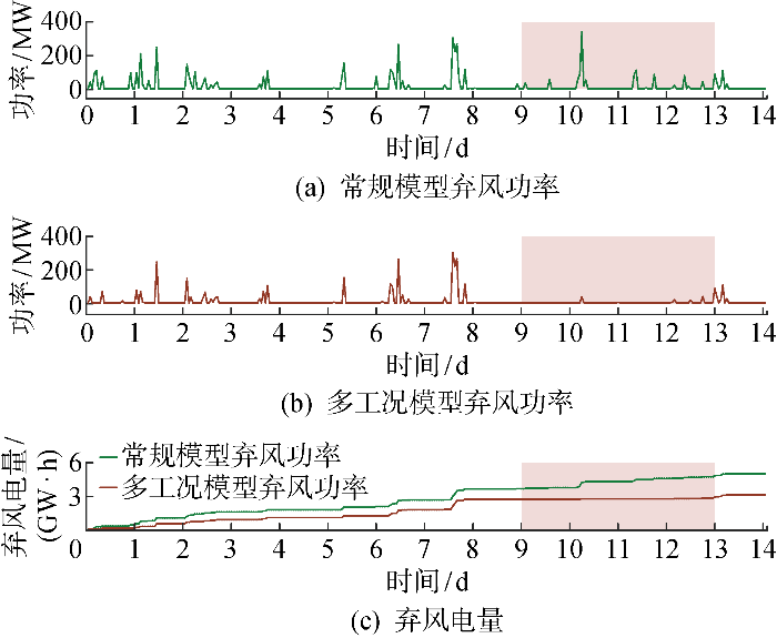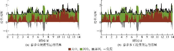 高比例风电电力系统夏季场景中风电出力水平较低且集中于负荷水平线以内,两类模型的调度弃风占比均小于1%,因此未对两类模型的弃风组成做进一步比较,高比例风电系统夏季调度运行结果详见附录B.