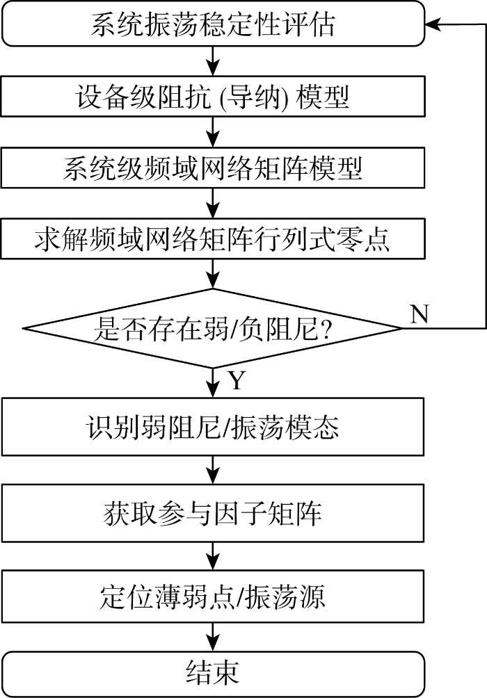 ... 对于一个点对点或者集中汇集并网的新能源电力系统,如图1(b) 所示,可以利用奈奎斯特稳定性判据评估系统稳定性并获取系统潜在的振荡频率;在潜在振荡频率处,根据无源性理论[22 ] ,获取各个场站的阻抗实部,根据电阻的大小进行薄弱点定位.对于图1(c) 所示的呈现环状拓扑特性的新能源电力系统,各个场站之间的连接对稳定性的影响不可忽略,很难划分为两个独立的源/荷子系统,面临分割点难以确定的问题.对于这类拓扑结构,可以采用频域模态分析法进行振荡稳定性评估,具体步骤如下:①建立新能源电力系统中各关键装备和场站的频域阻抗或导纳模型;②根据新能源电力系统的实际拓扑,构建系统的频域网络模型,进而获取系统的节点导纳矩阵模型或回路阻抗矩阵模型;③求解节点导纳矩阵模型或回路阻抗矩阵模型行列式的零点,评估系统是否存在弱或负阻尼模态;④若不存在弱或负阻尼模态,则间隔时间t 后,再次进行振荡稳定性评估;如果存在弱或负阻尼模态,则计算弱/负阻尼模态的节点参与因子矩阵;⑤根据参与因子矩阵定位系统的薄弱点或振荡源. ...