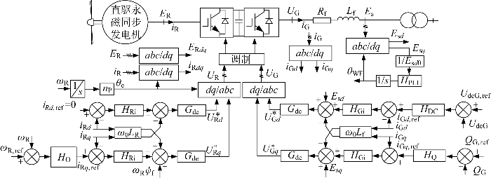 H Q 为无功功率控制的PI参数,H Gi 为电流内环的PI参数;H PLL 为锁相环PI参数;U G d * 、U G q * 为网侧换流器调制电压;U R 为机侧变流器调制电压;θ WF 为网侧变流器锁相环输出的角度;E s d 0 为公共连接点电压在d 轴的分量;θ e 为机侧park变化的角度;下标ref表示相应变量参考值;abc 表示abc 三相.