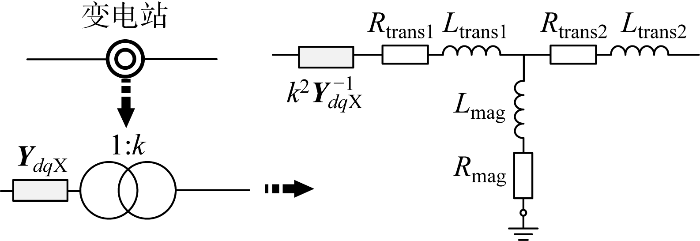 变电站主要用于连接不同节点以及传输线,其结构如图7 所示.将变电站低压侧阻抗Y d q X - 1 等效至高压侧,变电站中的变压器采用T型等效电路代替,等效后的导纳或阻抗如下: