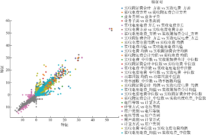 对用户用能数据进行预处理,以满足后续研究要求.用户用能数据包括以电费、功率因数为代表的数值型数据,也包括以行业类别、位置为代表的字符型数据,数据内容复杂且存在冗余.为此,首先基于用户用能服务数据进行特征组合构造,并根据相关性分析法初步去除冗余特征组合;随后改进合成少数类过采样技术(synthetic minority over-sampling technique, SMOTE)以适应用户用能数据特点,以此进行数据类不平衡处理.