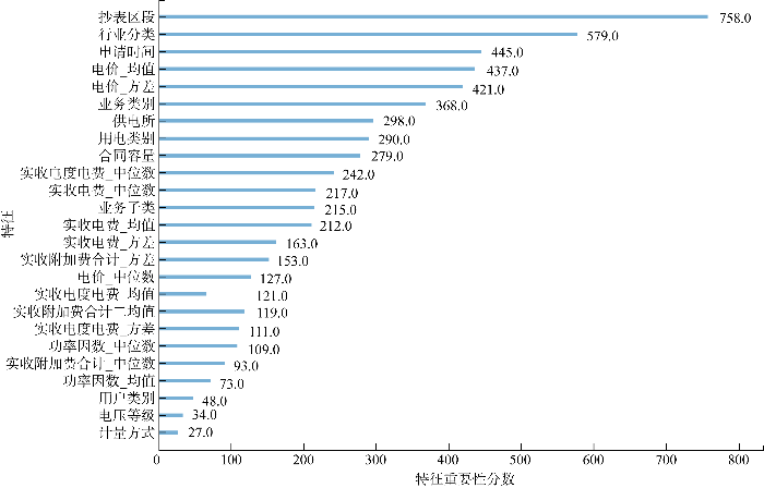 基于Pearson相关系数法进行特征分析并基于阈值进行筛选,如图1所示.可以看出,计量方式与用户类别、用户类别与计量方式、用户类别与电压等级等位于阈值0之下,不作考虑;为了提高精确性,本处仅设置阈值0作为特征筛选条件,后续非线性以及其他因素相关性均通过基于LightGBM的特征优选算法进行筛选.