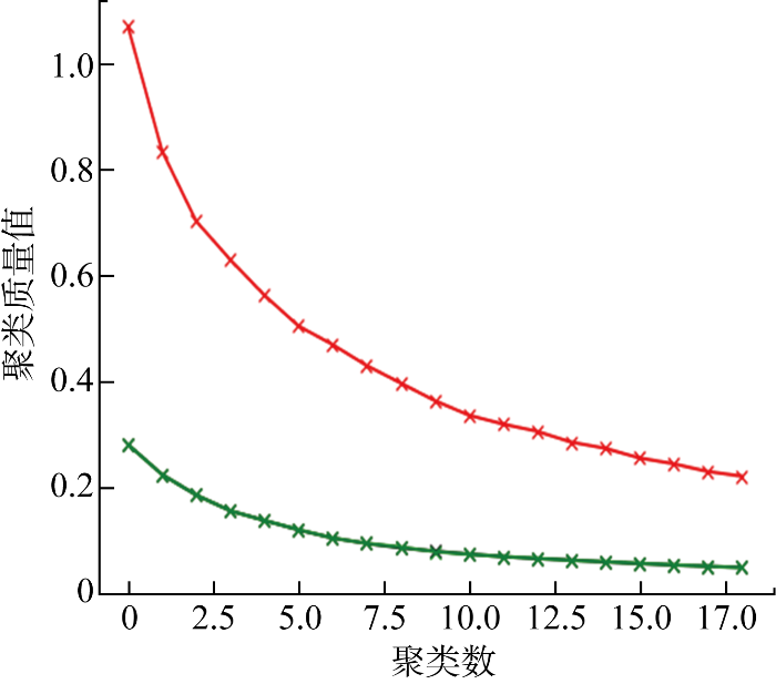 本文使用自动编码器对预处理后的数据进行降维处理,然后进行K-means算法聚类,以提高聚类效率,如图5所示.图中显示的是使用及不使用自动编码器对于聚类速度的对比,其中绿色线是使用了自动编码器的聚类速度,红线是未使用自动编码器的聚类速度,使用自动编码器对于聚类速度有较大提升,速度提升49.2%.