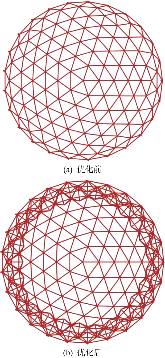 由于添加锥体的算法在设计时较为通用,单层网壳的局部加肋拓扑优化方法理论上可对采用三角形等其他多边形网格的单层网壳使用,如图14所示.采用四边形网格的网壳网格分布较规整,加肋路径易寻找,因此对其采用该方法效果最好.后续会改进该方法在其他多边形网格组成的单层网壳中应用的效果.