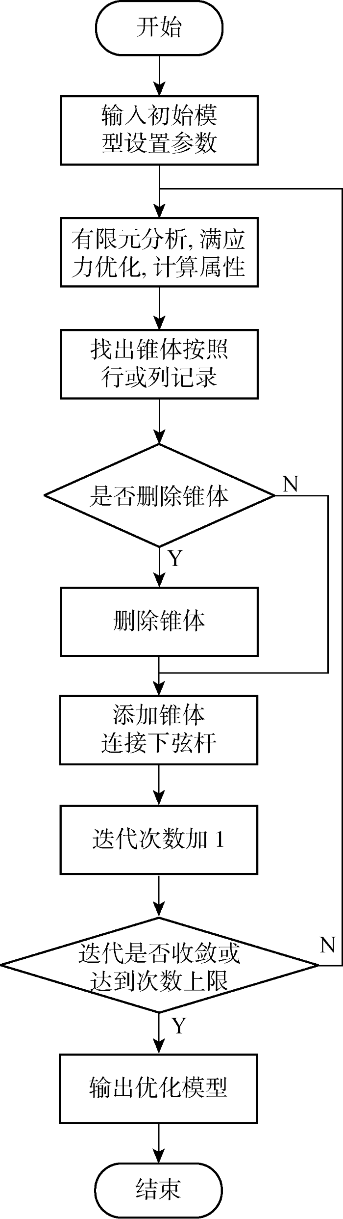 渐进式拓扑优化方法由4个部分构成:评价指标、优化准则、ESO方案设计和运算流程.根据《空间网格结构技术规程: JGJ 7—2010》[12]第4.3.1至4.3.5条的规定,用结构的失稳荷载因子衡量结构的整体稳定性;以结构用钢量为评价指标,结构的用钢量越小则结构越优.应变能代表在外力作用下,构件中以应变和应力形式储存的势能.对于单层网壳结构,构件作为梁单元进行运算时,其受力包括轴力、剪力和各方向的弯矩等.应变能的表达包含各种应力和应变情况,以应变能为基础的优化准则能够准确衡量构件承担内力的情况.根据单层网壳结构以网格为单元的特点,渐进式拓扑优化方法在优化过程中同样以网格为单元,将构件视为网格的组成部分.通过对构件的受力分析,判断其所在网格是否需要加强,以及新增锥体是否需删除.该方法以ESO为基础,需要根据ESO的理论设计相应的运算流程.