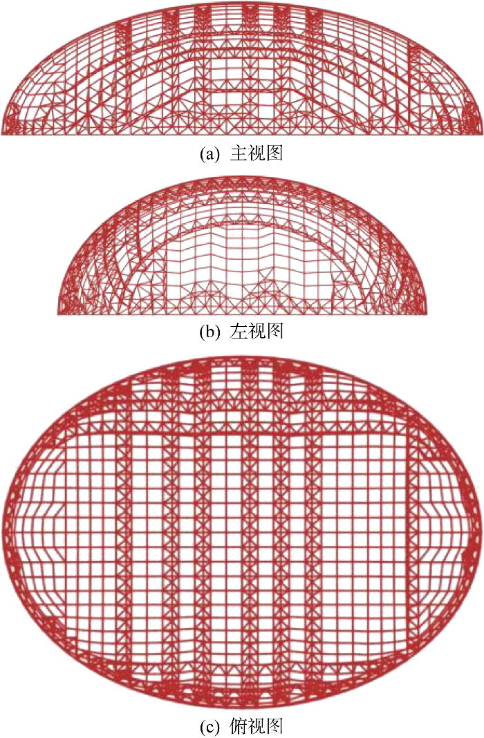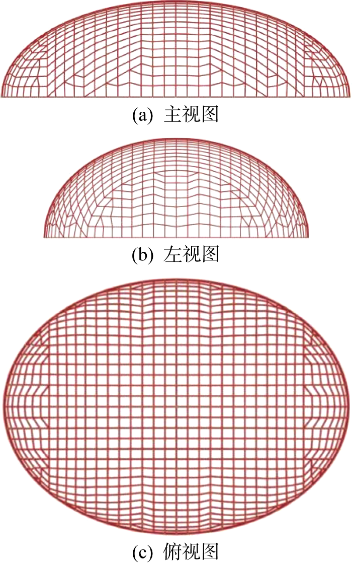 算例2 以图4所示的单层椭球网壳为模型2,该椭球壳取自大连某体育馆,其主要由四边形网格组成,在靠近网壳边缘处由三角形网格组成,所有杆件的初始截面均为⌀48 mm×3.5 mm圆钢管,后续会在满应力优化中更改.椭球网壳的长轴为152 m,平面椭圆短轴为112 m,网壳矢高为42 m,模型的边界节点每隔一个网格设置一个支座,考虑下部结构刚度,支座水平刚度取为25 MN/m.按照《建筑结构荷载规范: GB 50009—2012》[16]中相关规定对该模型施加荷载,包括0.3 kN/m2恒荷载,考虑半跨布置与整体布置的0.5 kN/m2活荷载和6种雪荷载.风荷载沿荷载面法向施加,基本风压为0.75 kN/m2,体型系数按回转面计算,地面粗糙度为B类,风振系数为1.5.经对模型2进行满应力优化设计,结构杆件用钢量为 1 022.53 t,该初步设计方案在自重+恒荷载+满布活荷载组合工况作用下且考虑材料非线性时的失稳荷载因子为1.32,不满足《空间网格结构技术规程: JGJ 7—2010》[12]的相关要求.采用局部加肋方案提高结构经济性与稳定性,验证算法在实际工程中的可行性.