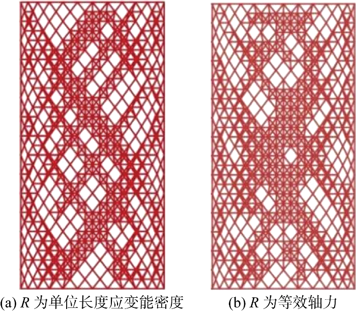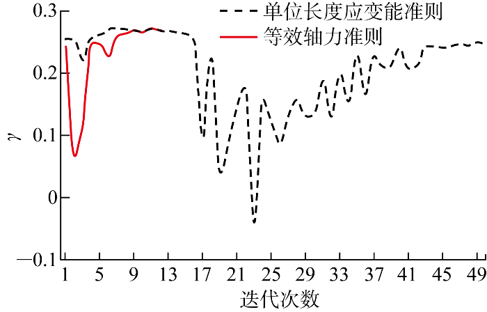 两种准则下的优化结果对比如图6所示.由对比可知,优化模型的失稳荷载因子与质量优化系数γ相差很小,采用等效轴力准则时迭代优化算法的运算效率远高于应变能准则.在结构对称且荷载对称的情况下,优化结构也应具有对称性,采用等效轴力准则时的最优优化结果对称性更好,因此选择等效轴力作为杆件的属性值RM与网格的属性值RG.