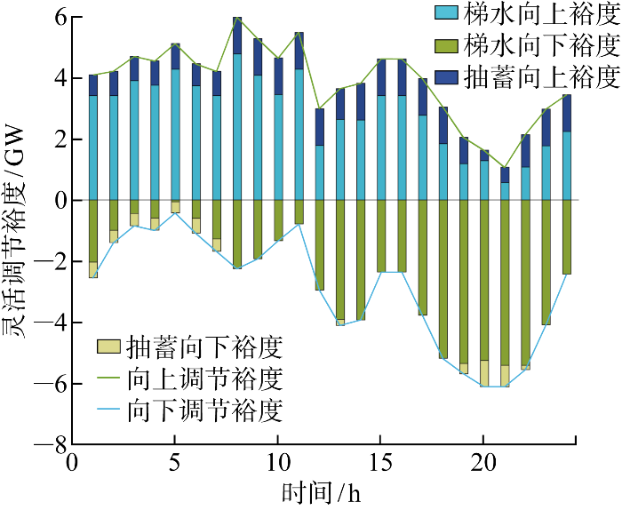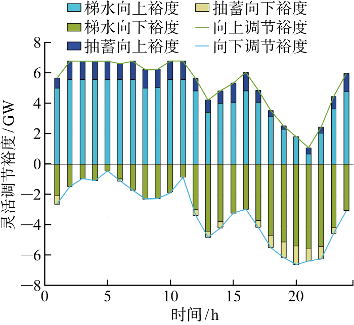 灵活调节裕度具有双向性,分为向上调节裕度F u 和向下调节裕度F d ,互补系统可提供灵活调节能力的机组有梯级水电和混合式抽蓄电站.由于抽蓄具有双向调节特性,所以需要考虑抽蓄处于发电状态还是抽水状态,总灵活调节裕度和向上/向下调节裕度的计算指标如下所示: