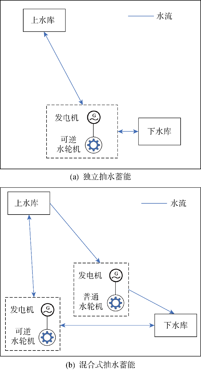 ... 从建造方案上看,抽水蓄能电站分为独立的抽水蓄能电站和混合式抽水蓄能电站,独立的抽水蓄能电站一般需要新建上下水库,这种方式的水量体积基本保持为定量,只是经上下水库循环往复,往往因站址资源稀缺而受限.混合式抽水蓄能电站依托已建水电站进行功能再造,利用梯级水电站水库做上水库或下水库,修建一个下水库或上水库,增建可逆机组或抽水泵即可.混合式抽蓄不仅具备独立抽蓄的各项功能,且造价更低、效率更高[32 ] ,图2 为独立抽蓄和混合式抽蓄的示意图,其中可逆机组既可以发电又可以抽水,普通水轮机则只有发电功能,本文采用的混合式抽蓄与常规独立抽蓄的区别主要体现在后续约束. ...