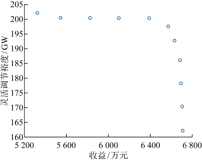 综上所述,本文引入混合式抽水蓄能电站,对包含梯级水风光和混合式抽蓄的互补系统优化调度问题进行研究,充分挖掘其灵活调节潜力.采用粒子群算法(PSO)优化长短期记忆(LSTM)模型对风光出力进行预测以克服主观选取超参数的局限性.在目标函数中引入反映调节潜力的灵活调节裕度指标,构建了考虑净收益和灵活调节裕度的多目标优化模型,采用法线边界交叉(NBI)法对多目标问题求解.算例分析重点讨论了考虑灵活性调节裕度的互补系统日前运行策略和抽蓄对系统灵活性的支撑作用,验证了所提模型的合理性和有效性.