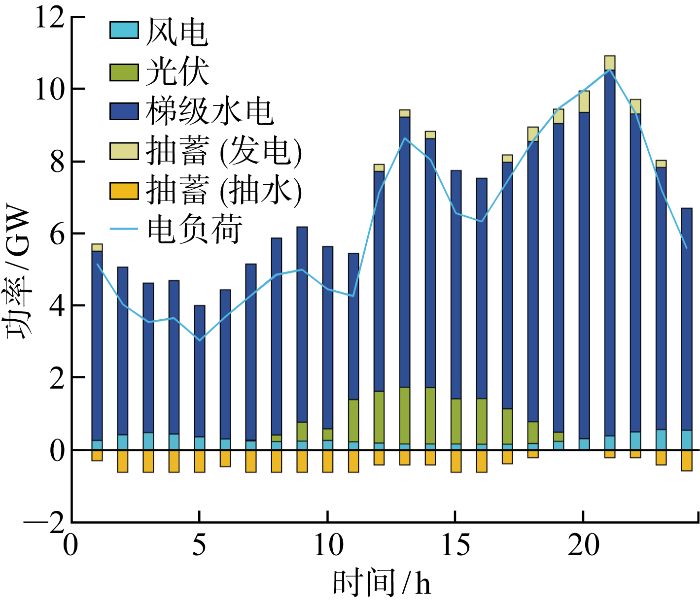 为实现能源的可持续发展,中国提出了“力争于2030年前实现碳达峰,努力争取2060年前实现碳中和”的目标[1 ] .在新型电力系统背景下要实现“双碳”目标,需充分开发和利用现存的风、光、水等可再生能源资源.然而,风光资源具有间歇性和波动性,大规模并网可能给电网带来冲击,且其大规模装机会挤压传统灵活性调节机组的生存空间,因此需要挖掘新的可再生灵活性资源[2 ] .水电的装机容量在我国位列第二,2022年装机容量占比为16.1%,仅次于火电机组,且水电调节能力强,可与随机波动的风光发电组成互补系统输出相对平滑、稳定的优质电源,有效破解风能、太阳能开发难题[3 ] .此外,国家发展改革委、国家能源局发布的《“十四五”现代能源体系规划》中也提到,要积极推动多能互补的清洁能源基地建设,优先利用存量电源实现多能互补,最大化利用可再生能源[4 ] .因此,水电的功能定位要从以电量为主逐步变为容量支撑,从而推动水风光互补的综合开发[5 ] ,但随着风光容量的增长,弃风弃光问题也难以避免,而普通水电无法有效贮存弃风弃光产生的电力.为此,需要考虑梯级水电的功能再造,即针对梯级水电站群加建抽水蓄能电站,研究梯级水风光蓄互补系统的灵活性运行策略.