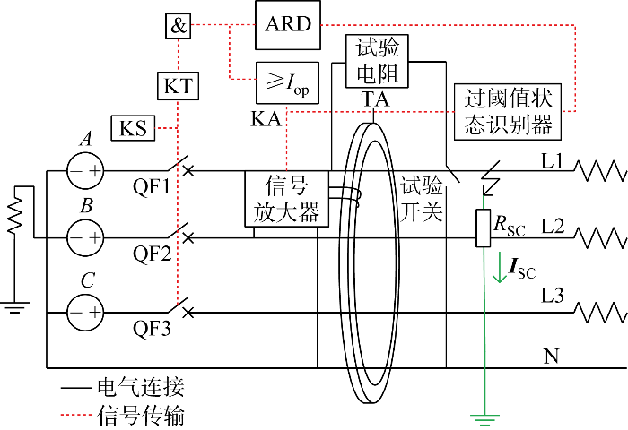 当线路中发生大功率负荷投切造成短时三相不平衡时,线路中会产生不平衡电流,通过TA一次侧线圈的矢量和不等于0, TA二次回路中同样有感应电压输出,此电压直接或通过信号放大器施加在脱扣线圈上,产生工作电流.KA工作,使得QF一次跳闸,若后续基于剩余电流信号特征提取的过阈值识别结果被判定为正常三相不平衡,则重合闸闭锁装置输出为1,重合闸启动,QF常闭触点闭合,线路恢复正常供电,保障电网供电连续性.