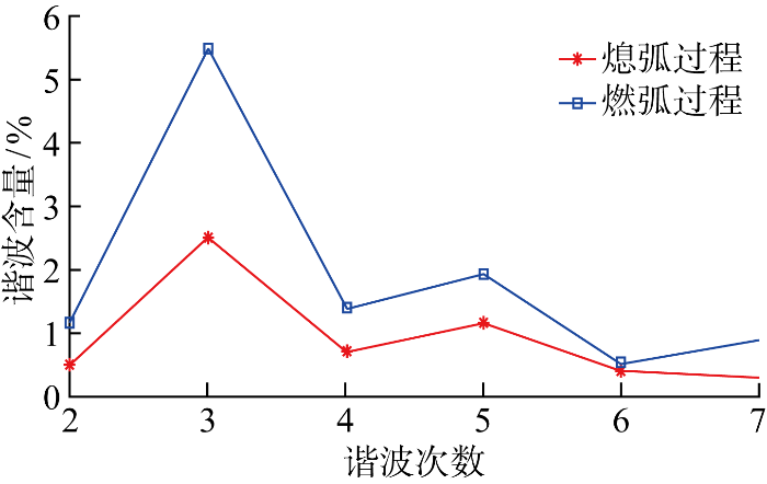 综合考虑生物的个体差异以及触电事故发生的随机性,在不同配电网接地形式下,设置电弧模型、人体阻抗和线路参数,获取80组仿真剩余电流信号,参数设置见表1.图4所示为动态仿真获取的相关剩余电流信号,图4(a)中生物体触电时刻发生在 t=0.04 s;t=0.04~0.09 s 的S2期间生物体触电伴随电弧现象,在过零点时具有零休现象;t=0.09 s 时生物体触电电弧熄灭,t=0.06 s 时断路器发生一次跳闸.利用傅里叶变换技术分析的一次跳闸前剩余电流波形谐波分量如图5所示.从波形形态角度看,由图4(a)可知,在燃弧阶段剩余电流波形存在较强的过零畸变;在熄弧阶段虽然有电容的存在,但人体阻抗基本呈现电阻性,剩余电流波形为稳定的正弦波形,无明显波形畸变,与已有的生物触电现场试验数据波形特征基本吻合.从频域角度看,由图5可知,在燃弧阶段各次谐波含量均维持在6%以下,在熄弧阶段各次谐波含量均维持在3%以下,与已有的生物体触电现场试验数据频域特征基本吻合.