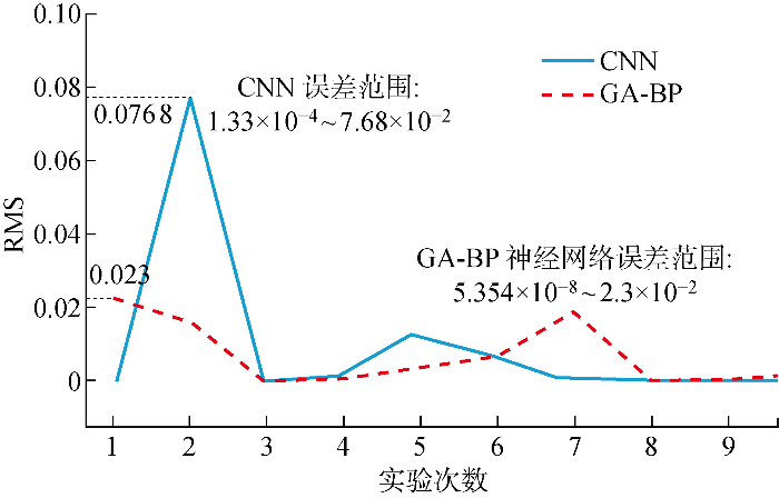 为评估遗传算法-反向传播(GA-BP)网络过阈值分类识别效果,将GA-BPNN与卷积神经网络(convolutional neural networks,CNN)状态分类效果进行对比,进一步验证GA-BP实现过阈值状态分类的快速高效性.CNN的输入为3.2节提取的REMD近似熵特征向量和IMF时域特征向量,对于两种不同情况下的数据集以1∶1比例分开,从表3中各类别随机选取64组共128个REMD近似熵特征值,同时结合表4中相应的时域特征值作为测试集.训练集和测试集以4∶1的比例划分,采用GA优化算法确定BP的初始化参数,为对比不同初始化参数下的自适应重合闸判据构造效果,选择原始网络随机生成初始化参数的BP神经网络进行判据构造.分别从预测值与实际值之间的均方根误差(RMS)、拟合程度相关系数等方面来对比两种网络的性能.图7为CNN和GA-BP运行10次下的均方根误差范围.
