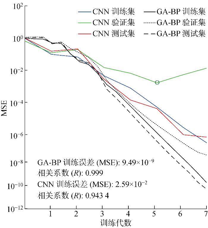 为评价GA-BP神经网络与CNN的模式分类效果和网络性能,绘制网络训练过程曲线,引入相关系数R作相关性分析.相关系数R代表预测输出和目标输出之间的相关性,R值越接近1表示预测和输出数据之间的关系越密切,R值越接近0表示预测和输出数据之间的关系随机性越大.图8为CNN和GA-BP神经网络某一次具有代表性的训练过程曲线.由图可知,随着训练代数提升,CNN测试集的均方误差(MSE)并不呈现严格下降趋势,而GA-BP神经网络呈现出严格下降趋势,说明GA-BP网络性能优于CNN;另外,CNN的训练均方误差达到2.59×10-2,而GA-BP神经网络的训练均方误差仅为9.49×10-9,说明GA-BP识别精度更高.从相关系数的角度来看,CNN的相关系数为 0.943 4,GA-BP 神经网络的相关系数为0.999,说明GA-BP神经网络识别结果和输出数据之间关系更密切,可见GA-BP对剩余电流保护装置检测值过阈值状态识别精度更高,用于过阈值状态识别更准确,故更宜采用GA-BP神经网络进行状态识别.