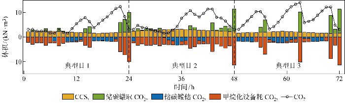 电转气(power to gas, P2G)技术的出现不仅加深了电-气系统的耦合,还提供了可再生能源的消纳途径[9].文献[10]中探究了P2G设备和风电场协同扩建对气电互联系统规划、风电消纳和经济性3方面的影响;文献[11]中建立了含P2G设备的电-气系统双层优化模型,并得出了P2G可以有效提高系统风电消纳能力的结论;文献[8]中以电转气等装置为耦合设备,构建了一种电-气综合能源系统随机优化规划模型,通过合理的规划提高电-气综合能源系统的经济性,同时降低系统的碳排放量.在上述研究中,P2G设备运行时需要购买CO2以满足甲烷化阶段的碳原料需求,从而增加了系统的CO2购买成本.碳捕集(carbon capture and storage, CCS)技术能够将CO2从能源产业排放的废气中分离出来,是实现IES低碳化的关键技术之一[12].CCS设备捕集的CO2可以作为碳原料提供给P2G设备,达到提高系统的经济性、降低碳排放的目的[13-15].P2G设备的工作过程可以分为两个阶段:第1阶段电解槽设备消耗电能产生H2,第2阶段甲烷化设备消耗H2和CO2产生天然气.H2具有能量密度高、燃烧产物清洁等优点[16],充分考虑第1阶段产生的H2的零排放优势,通过氢能的多途径利用,能够提高能源利用效率和能源低碳化,因此有必要对P2G设备工作过程的两个阶段进行精细化建模,然而现有研究往往对P2G设备进行整体化建模,忽略了其两阶段的运行过程.燃气轮机(gas turbine, GT)作为连接电-气系统的另一个桥梁,通过燃烧天然气产生电能来平抑风电出力的波动性,已有研究表明在天然气中掺入H2的体积比例在20%以内时,燃气轮机可以安全稳定运行[17].文献[18]中对燃气轮机掺氢后的运行特征进行研究,得出掺氢运行可提升燃气轮机发电效率的结论;文献[19]中搭建了含掺氢燃气轮机的多微网系统架构,对其优化调度问题展开研究.因此,可以考虑通过燃气轮机和两阶段P2G设备耦合运行,来增加H2的利用途径从而提升系统低碳化水平.