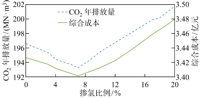 ... 电转气(power to gas, P2G)技术的出现不仅加深了电-气系统的耦合,还提供了可再生能源的消纳途径[9].文献[10]中探究了P2G设备和风电场协同扩建对气电互联系统规划、风电消纳和经济性3方面的影响;文献[11]中建立了含P2G设备的电-气系统双层优化模型,并得出了P2G可以有效提高系统风电消纳能力的结论;文献[8]中以电转气等装置为耦合设备,构建了一种电-气综合能源系统随机优化规划模型,通过合理的规划提高电-气综合能源系统的经济性,同时降低系统的碳排放量.在上述研究中,P2G设备运行时需要购买CO2以满足甲烷化阶段的碳原料需求,从而增加了系统的CO2购买成本.碳捕集(carbon capture and storage, CCS)技术能够将CO2从能源产业排放的废气中分离出来,是实现IES低碳化的关键技术之一[12].CCS设备捕集的CO2可以作为碳原料提供给P2G设备,达到提高系统的经济性、降低碳排放的目的[13-15].P2G设备的工作过程可以分为两个阶段:第1阶段电解槽设备消耗电能产生H2,第2阶段甲烷化设备消耗H2和CO2产生天然气.H2具有能量密度高、燃烧产物清洁等优点[16],充分考虑第1阶段产生的H2的零排放优势,通过氢能的多途径利用,能够提高能源利用效率和能源低碳化,因此有必要对P2G设备工作过程的两个阶段进行精细化建模,然而现有研究往往对P2G设备进行整体化建模,忽略了其两阶段的运行过程.燃气轮机(gas turbine, GT)作为连接电-气系统的另一个桥梁,通过燃烧天然气产生电能来平抑风电出力的波动性,已有研究表明在天然气中掺入H2的体积比例在20%以内时,燃气轮机可以安全稳定运行[17].文献[18]中对燃气轮机掺氢后的运行特征进行研究,得出掺氢运行可提升燃气轮机发电效率的结论;文献[19]中搭建了含掺氢燃气轮机的多微网系统架构,对其优化调度问题展开研究.因此,可以考虑通过燃气轮机和两阶段P2G设备耦合运行,来增加H2的利用途径从而提升系统低碳化水平. ...