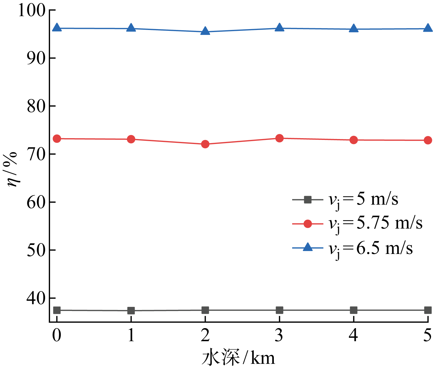 | Fig.3 Influence of water depth on pick-up efficiency at different jet velocities |