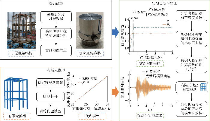 但当前模型更新研究选用的待更新参数多为刚度、弹性模型和质量密度,将结构与基础的连接视为完全刚性约束,缺少对边界具体情况的考虑,容易导致更新结果精度不足,且传统的MH算法采样收敛速度较慢、更新效率低下,在参数增多时易陷入采样停滞.因此,本文将边界条件加入待更新参数,引入鲸鱼优化算法(whale optimization algorithm,WOA)以提升传统MH算法的采样效率,建立反映待更新参数和模态响应关系的径向基函数(radial basis functions,RBF)代理模型,以代理模型代替有限元模型完成模型更新.最后,将所提方法应用在简支梁数值算例和3层框架结构的更新上,通过振动台实验证明了方法的有效性.