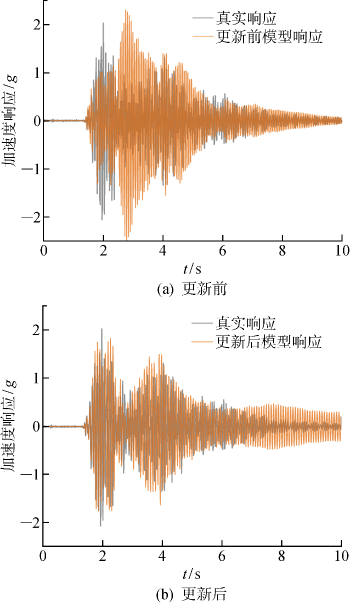 为了进一步验证模型更新效果,进行3层框架的振动台实验,对结构施加峰值加速度为0.4g 的El-Centro波,得到顶层x 方向的实际加速度时程曲线.利用更新后的有限元模型预测结构顶层x 方向的加速度时程曲线,并与实测的加速度时程曲线对比,如图10 所示.参数更新后,有限元模型预测的结构加速度响应与实测响应的峰值和形状更加接近,更能反映真实的结构特性.