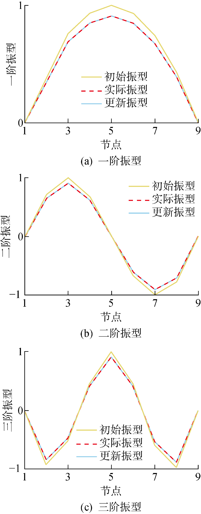 绘制模型更新前、模型更新后和真实的前3阶振型,如图6 所示.计算有限元模型在WO-MH更新前后的模态响应值及其和真实模态响应值的误差,结果如表3 所示.由表3 和图6 可知,更新后的有限元模型的响应精度大幅提升,最大误差为0.009%,最小误差为0%,且更新后的振型和真实振型吻合很好,参数更新的效果显著.