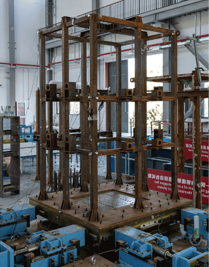 ... 结构设计方案中所有钢材的弹性模量为206 GPa,质量密度为 7 850 kg/m3 ,框架与基础为完全刚接.参照结构设计方案设计有限元模型,钢构件使用线单元建模,梁中的支架简化为对应位置节点上的附加集中质量,此时模型X 向一阶频率18.707 Hz,与实测频率相差较大.考虑到施工完成的框架底板与基础之间以螺栓连接,并非完全固接,按照完全刚接考虑不够合理,因此将边界条件加入更新参数.将有限元模型中柱和基础之间的连接使用两根线性弹簧来表示,分别代表绕x 轴转动和绕y 轴转动的扭转刚度[20 ] . ...