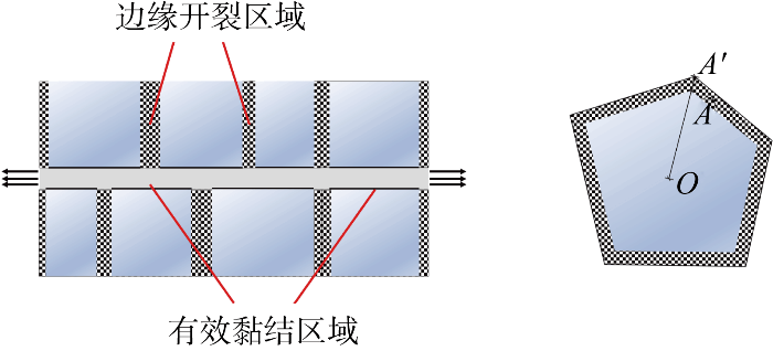 根据试件在拉伸过程中,玻璃碎片边缘局部开裂而核心区域通常不出现二次开裂,以及碎片密度较大的试件在拉伸荷载施加后期,可能同时存在边缘开裂和局部脱胶的现象,本文提出有效黏结假设:单轴拉伸试件在受拉过程中,应力路径只通过有效黏结区域,碎片边缘开裂区域对于试件的抗拉性能影响可以忽略,如图10所示.图中:O为碎片形心;A为有效黏结区域顶点;A'为碎片顶点.