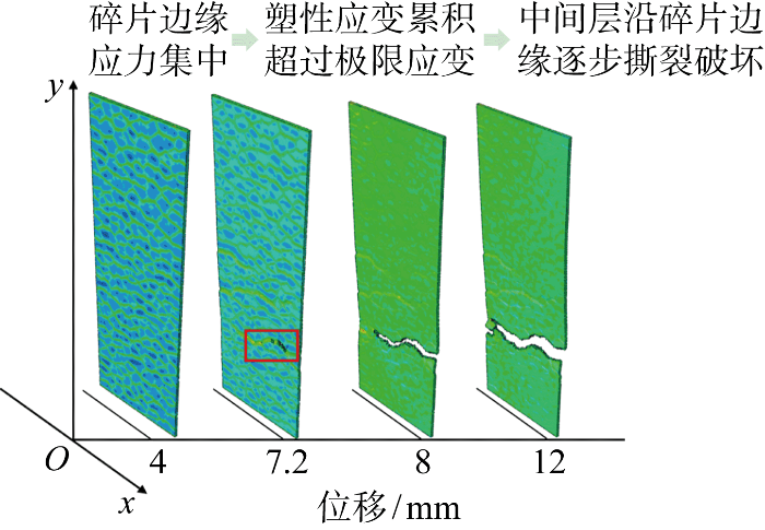 (1) 绝大部分SG夹层玻璃单轴拉伸试件的玻璃碎片在加载过程中整体形态保持完好,并且未观察到明显的脱胶现象,但玻璃碎片边缘会出现局部二次开裂并形成致密的玻璃碎渣.SG中间层的起始失效位置和撕裂失效走向受碎片形状影响显著,起始失效位置主要出现在前后碎片层的对齐裂缝处.