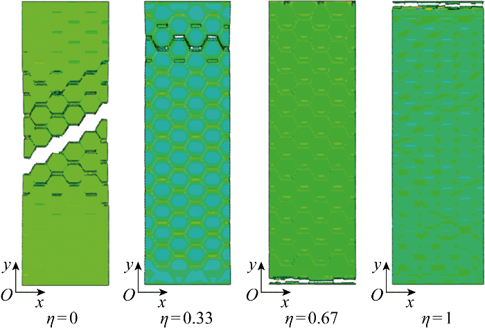 其中:d为中间层两侧最邻近玻璃碎片重心在xOy平面上的投影距离;h为正六边形碎片的边心距.碎片层交错程度设置如图14所示,η=0代表两侧碎片层完全重合,η=1代表两侧碎片层完全交错.