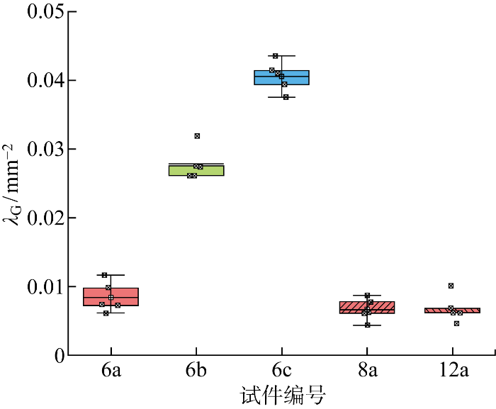 现有研究主要侧重于从黏结面性能、中间层材料、碎片尺寸等角度探讨夹层玻璃开裂后性能的影响因素.Samieian等[11]通过随机裂纹拉伸试验(random-cracked tensile test, RCT)研究了界面黏结性能对夹层玻璃的开裂后力学性能影响,结果表明随着黏结性能的提升,开裂后夹层玻璃的初始弹性模量和极限应力逐步增大.Biolzi等[12]对聚乙烯醇缩丁醛(PVB)中间层和PVB/聚碳酸酯(PC)复合中间层夹层热钢化玻璃梁的开裂后性能进行了试验研究,研究发现当两侧玻璃层完全开裂时,复合中间层相比PVB中间层能够为开裂后的夹层玻璃提供更高的抗弯能力和更长的持载时间.Biolzi等[13]对SG离子型中间膜夹层热钢化玻璃(简称SG夹层玻璃)的开裂后力学性能进行了试验研究,指出由于玻璃碎片与SG中间层间的剪力传递,玻璃碎片能够对中间层产生拉伸硬化(tension stiffening)效应,显著提高开裂后夹层玻璃的整体抗拉刚度.Yang等[14]对乙烯-醋酸乙烯酯共聚物(EVA)中间层和EVA/PC复合中间层的夹层玻璃试件进行贯穿裂纹拉伸试验(through-cracked tensile test, TCT),详细分析了不同温度、湿热、光照等老化条件对夹层玻璃试件开裂后性能的影响,并指出碎片间的局部桥接能力对于夹层玻璃的开裂后性能影响显著.Wang等[15]通过离散元(DEM)方法建立了PVB夹层玻璃的多条贯穿裂纹拉伸试验(MTCT)数值模型,发现拉伸硬化效应通过应力路径来影响夹层玻璃的开裂后性能,并且碎片密度、裂纹交错、界面脱胶对应力路径均产生影响.朱禹翰等[16-17]对物理热钢化玻璃裂纹形态的影响因素展开了试验研究,研究发现物理热钢化玻璃的碎片密度、圆度、周长等裂纹形态指标主要取决于玻璃厚度和表面应力,并指出裂纹形态与玻璃开裂时的应变能释放有关.陈素文等[18]考虑了碎片边长大于15 mm、边长5~10 mm、边长小于5 mm 3种碎片尺寸范围来研究玻璃碎片尺寸对于浮法夹层玻璃开裂后性能的影响,研究发现,随着碎片尺寸减小,PVB浮法夹层玻璃承载能力降低、变形能力提高;对于SG浮法夹层玻璃,各尺寸碎片在加载过程中均会二次开裂成更致密的碎片,因此碎片尺寸对SG浮法夹层玻璃的承载力与变形能力影响较小.