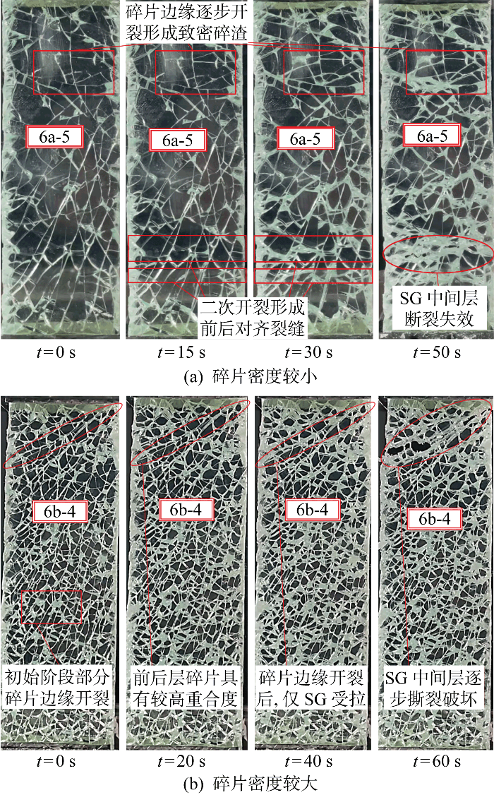 试件6b-4的失效过程如图4(b)所示.可以发现在加载开始前,相比于试件6a-5,碎片密度较大的试件6b-4存在较多边缘预开裂的玻璃碎片.这一方面是由于钢化水平越高,钢化玻璃开裂瞬间释放的应变能越大,更容易造成碎片边缘预开裂;另一方面是由于钢化玻璃在开裂后的一段时间内,残余应变能会持续释放,部分残余应变能较高的碎片会在此过程中发生二次开裂,并形成碎片团簇.试件6b-4在加载过程中,由于玻璃碎片尺寸较小,碎片仅在边缘产生局部二次开裂,且在预裂纹影响下未观察到明显的局部脱胶.当加载时间40 s时,试件上方在碎片边缘开裂处形成前后对齐裂缝,SG中间层在对齐裂缝处受拉变形并逐步撕裂.
