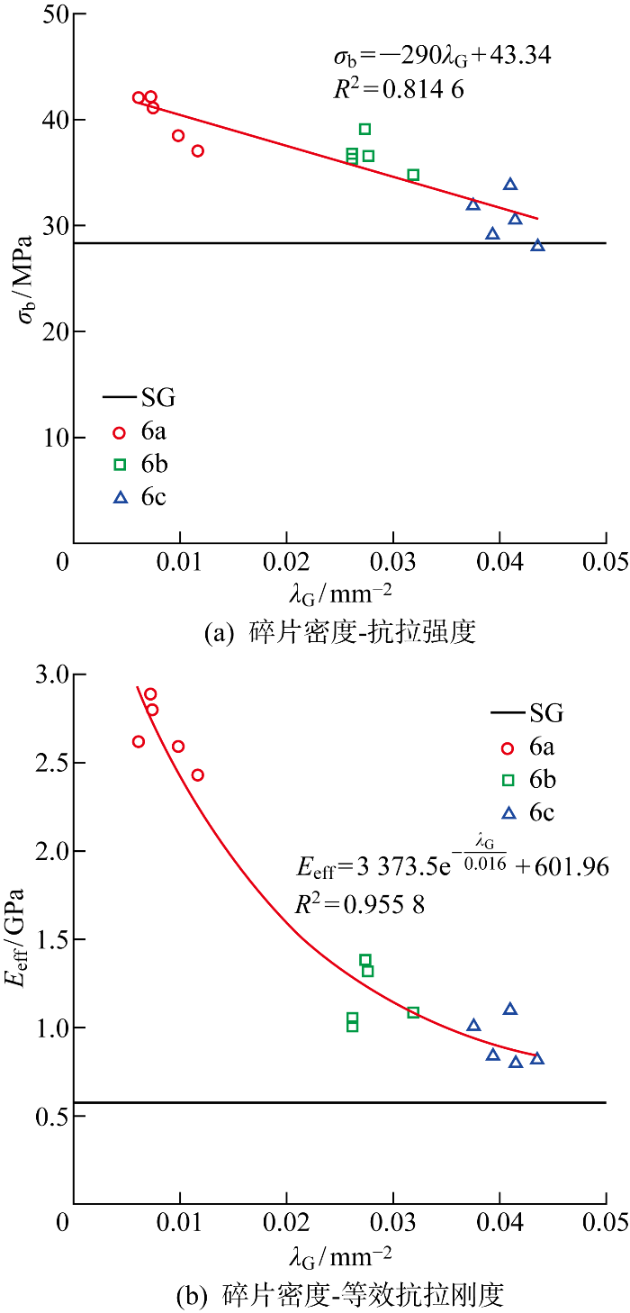 碎片密度是描述裂纹形态的重要指标之一,为进一步分析碎片密度对SG夹层玻璃开裂后硬化效应的影响,图8给出了6 mm厚各试件的抗拉强度和等效抗拉刚度随碎片密度的变化关系.图中:R2为决定系数.