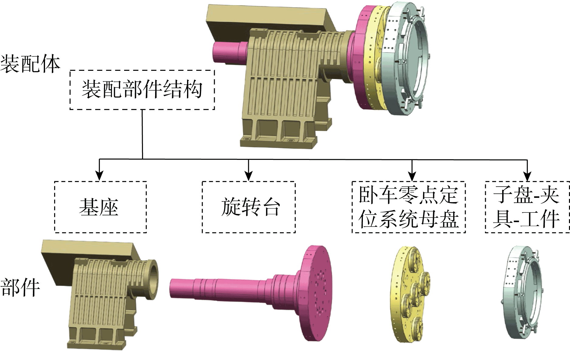 | 图6 机床-夹具-工件装配系统的简化装配模型和装配层级 |