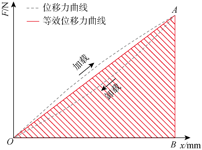 OA加载曲线下方的区域代表弹簧在一个周期内储存的最大变形能W,而OA等效刚度曲线绕x轴的三角形面积则由图中红色阴影区域表示,该区域代表在一个周期内储存的最大弹性势能U.滞回曲线直观地表示了阻尼合金材料在循环加卸载下的能量损耗情况.损耗因子是用来量化这类能量损耗的指标.静态损耗因子η的公式清楚地表明了材料在振动周期中损失与存储的能量之间的比例关系: